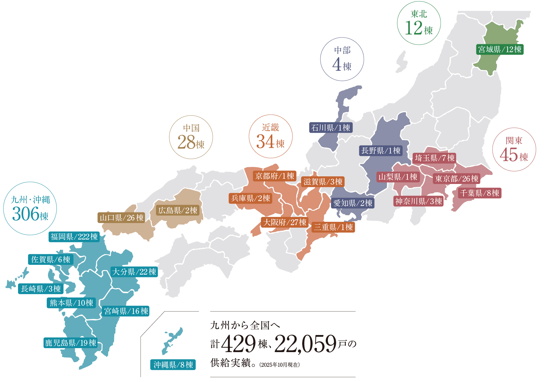のマンションブランドを中心に展開しています。 - 北九州・福岡をメインに、東京、埼玉、千葉、神奈川、山梨、長野、石川、宮城、大阪、兵庫、京都、滋賀、山口、広島、大分、佐賀、熊本、長崎、宮崎、鹿児島、沖縄に進出し、その供給実績は既販売分を含めると400棟を超えています。