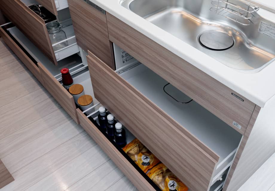 - シンク下にはザルやボウルもすっぽり収まる幅の広いスライド収納を確保しています。