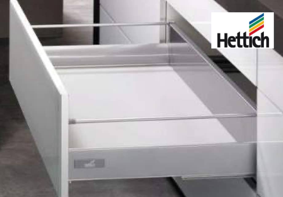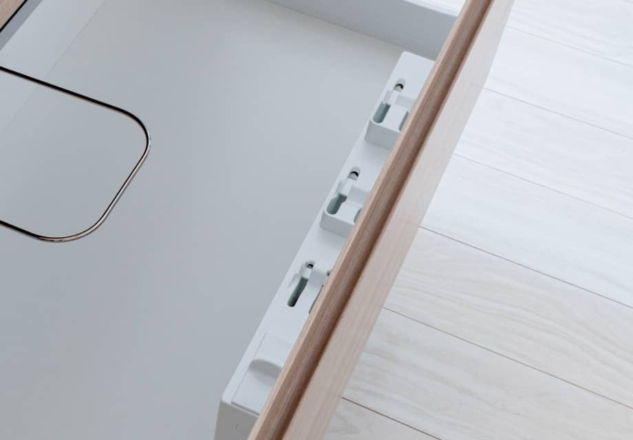 - スライドレールにはヘティヒ社製レールを使用しているため、重量物を入れた時でもスムーズな引き心地を実感でき引出しを閉める時の不快な音をシャットアウトします。