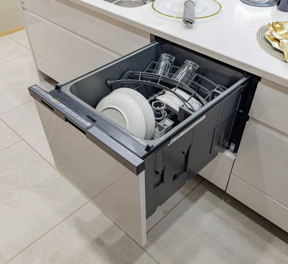 - 50℃以上の高圧水流により、洗浄工程でしっかりと除菌できる食器洗い乾燥機を採用。運転開始時間を設定できるので、騒音が気になる深夜の使用も安心です。