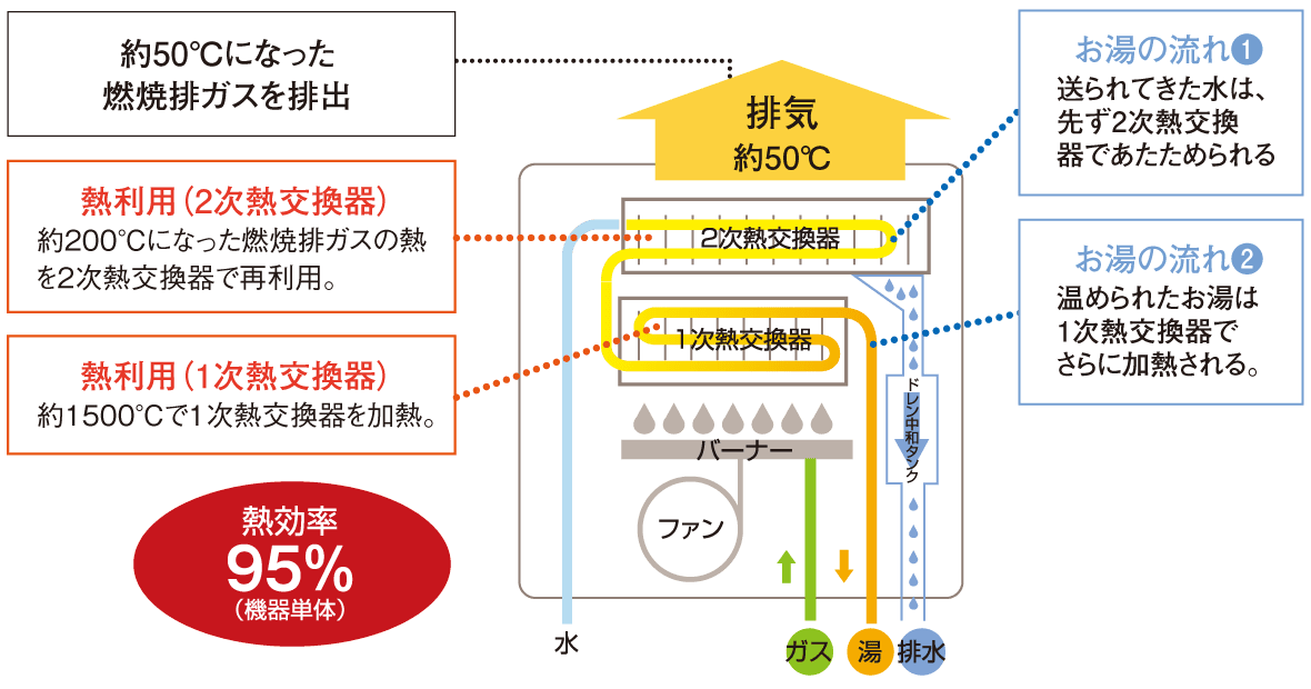 エコジョーズは、従来捨てていた排気の熱を利用します。