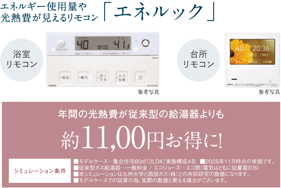 たっぷりお湯が使えて、しかも経済的。ガスの高い熱効率をプラスした、地球環境と暮らしに優しいワンランク上の給湯器です。