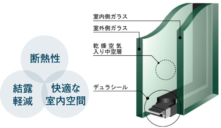 - 2枚の板ガラスの間に乾燥空気を入れて密封したペアガラスを採用しました。断熱性に優れ冷暖房効果を高めながら、結露防止にも有効です。