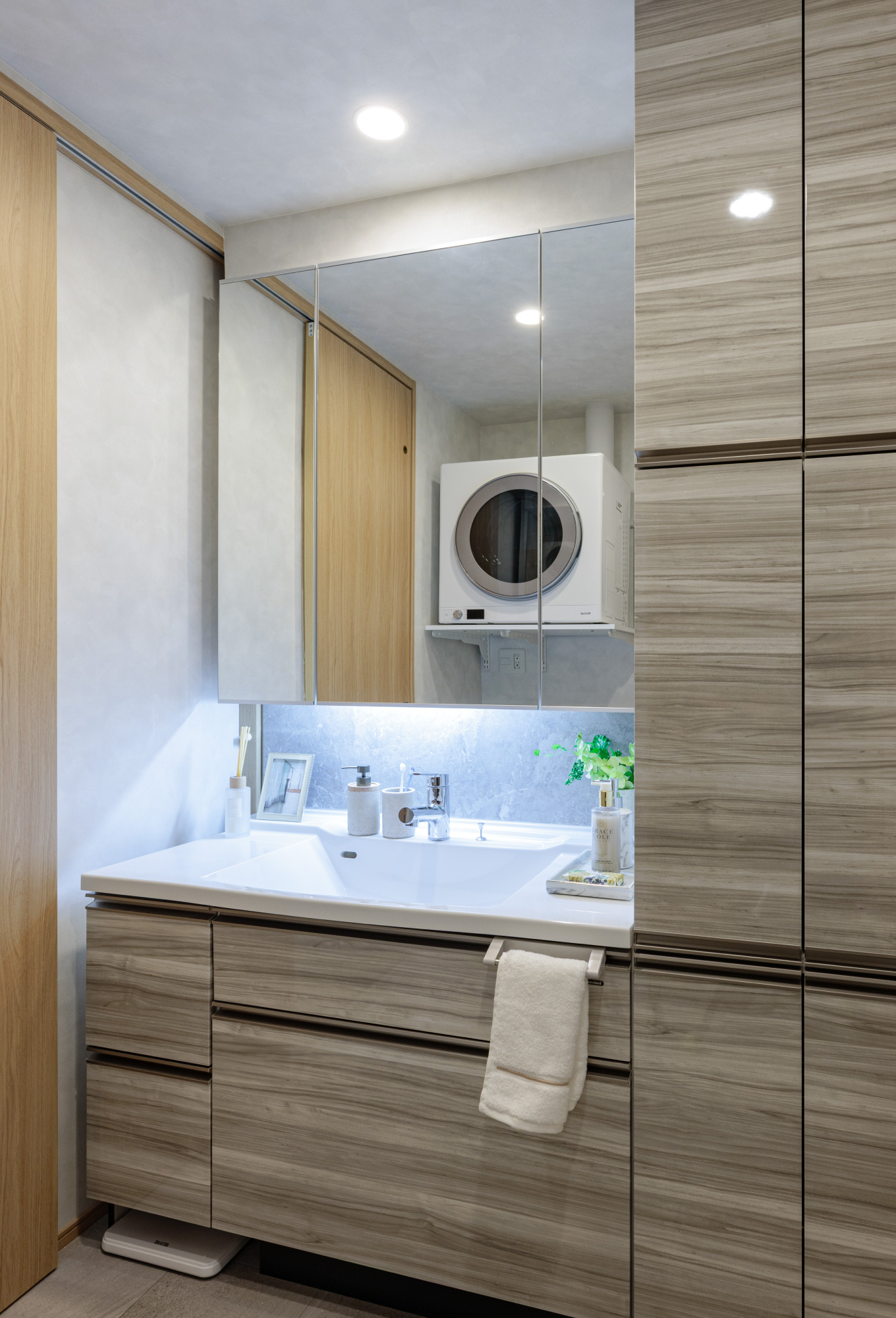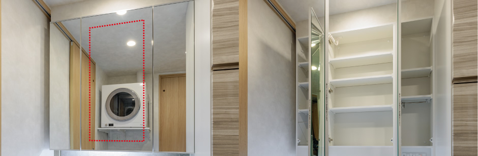 - 身支度がはかどる便利な三面鏡を採用。鏡内の収納部分には、小物やストック品がたっぷり収納できます。※曇り止めヒーターは中央の鏡のみになります。
