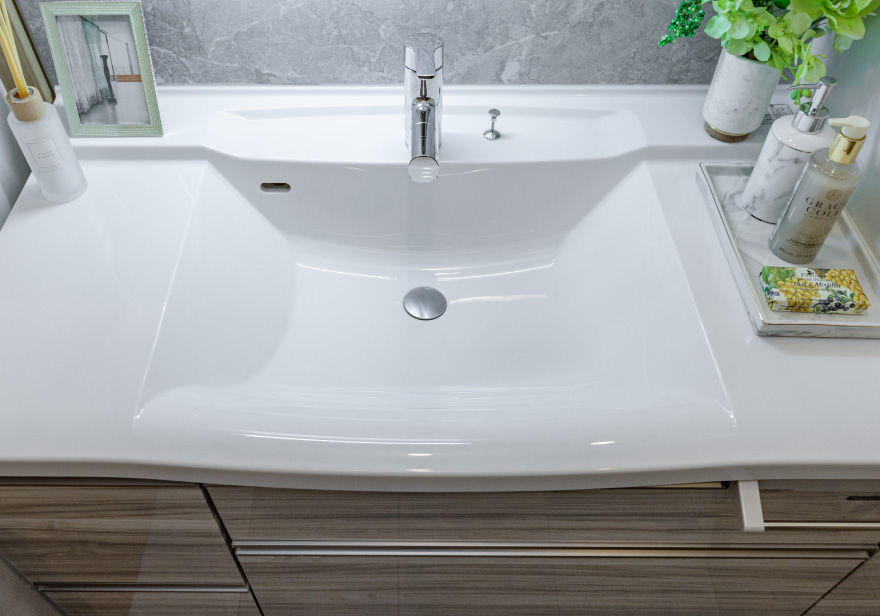 ボウル一体型カウンター - 天板とボウルの継ぎ目がない一体型カウンタートップ。ゆるやかにラウンドしたボウル形状と、光沢仕上げの天板が高級感を演出します。