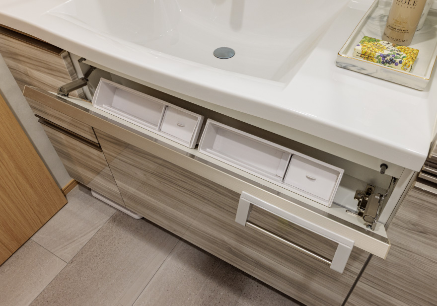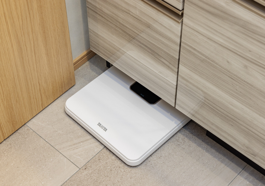 - 洗面台の下には、ヘルスメーターを収納するのに便利なスペースを設けています。