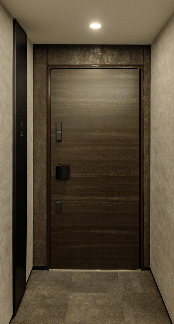 - 玄関扉横上に設置された玄関灯は、住戸の玄関先を優しい灯りが明るく照らします。
