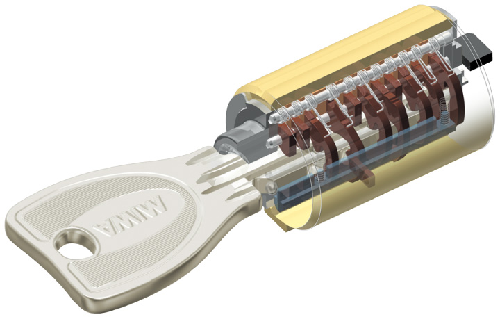 - 理論鍵違いは1,000億通りと複製はほぼ不可能で、高い安全性をもっています。精密・複雑なロータリータンブラー方式とロッキングバー方式を組み合わせたハイセキュリティシリンダー。