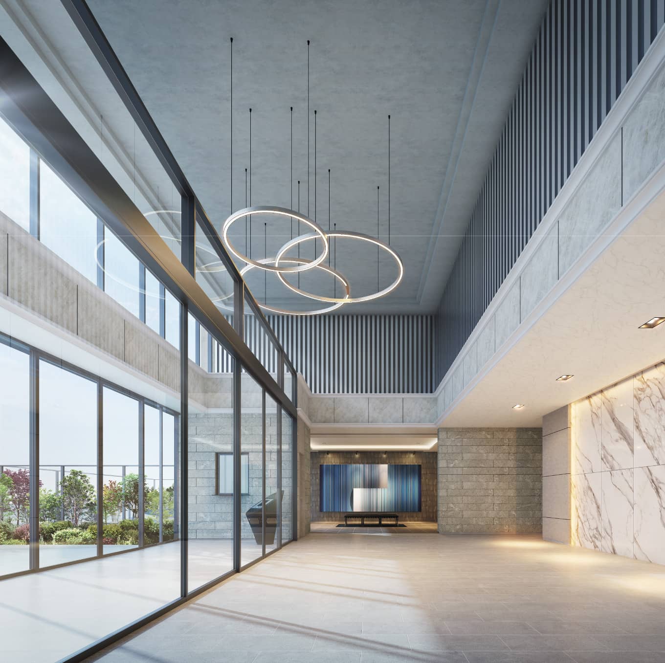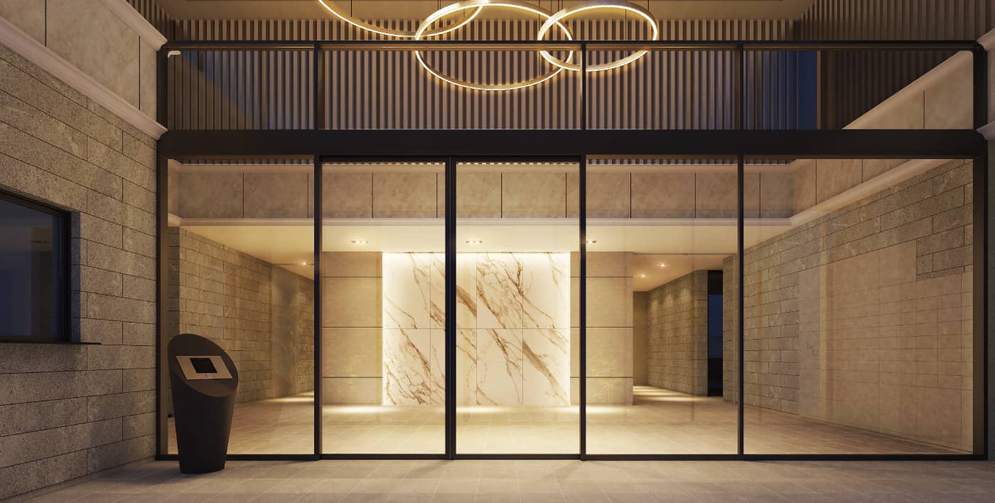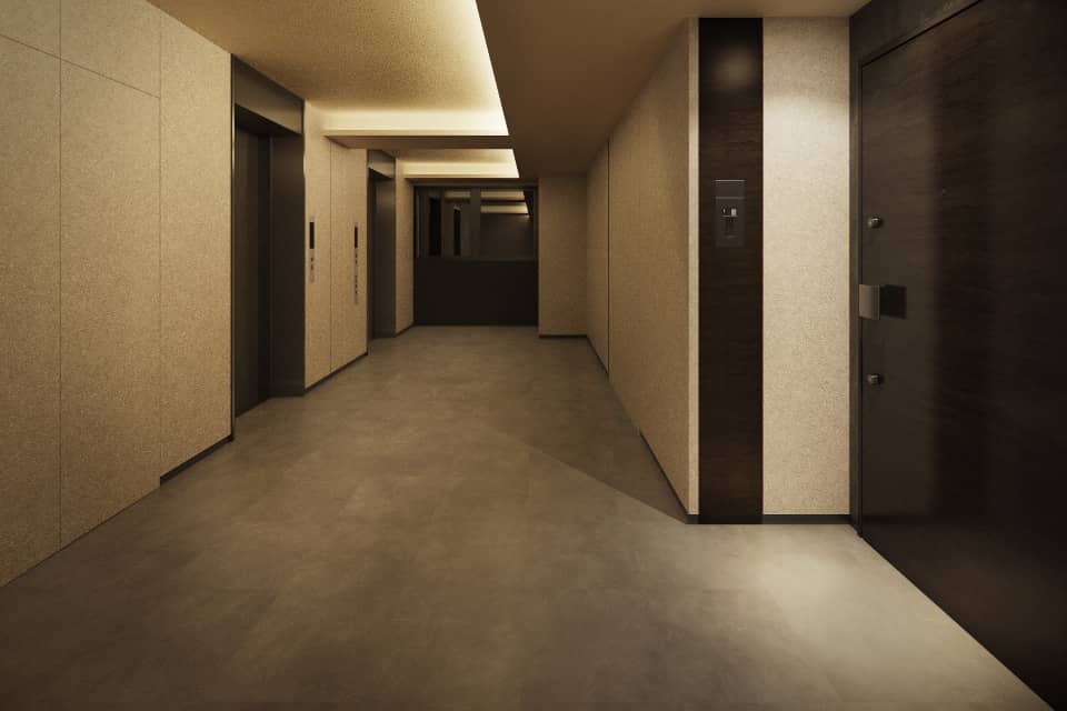 - 内廊下の内装は、ホテルのようなデザインや間接照明で高級感のある内装となっています。エレベーターからご自宅の玄関までが、屋外ではなく、ラグジュアリーな屋内空間となることで、日常で心地よさとステイタスを感じていただけます。