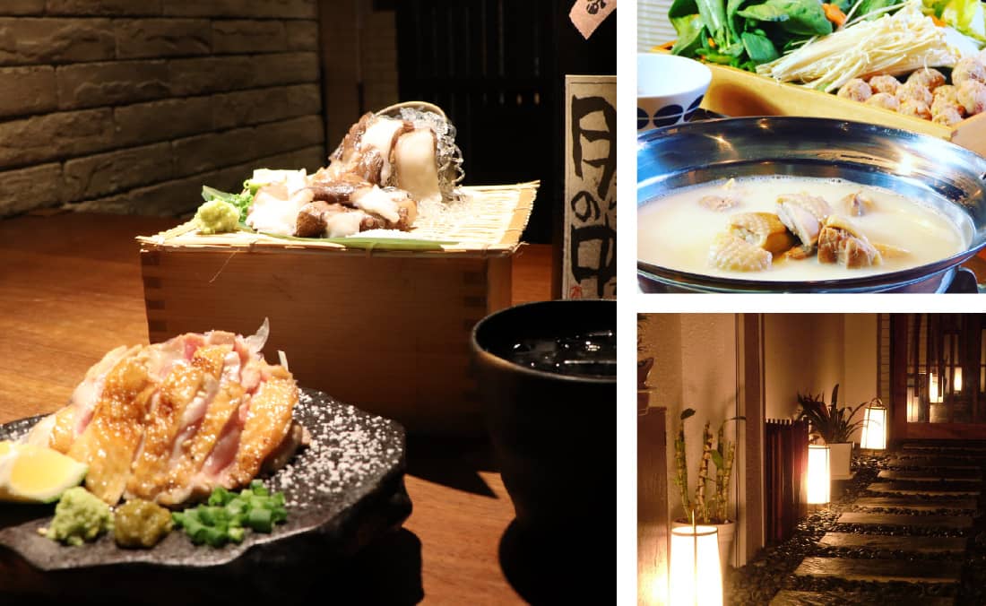 京都の路地に来たような、風情あふれるエントランスから店内へ。毎日仕入れる九州産朝引き鶏による炭火焼、宮崎の名物料理もも肉の炭火焼、鶏スープの水炊きなど極上の鶏料理が楽しめます。友人との会食から、大切なおもてなしにも最適です。